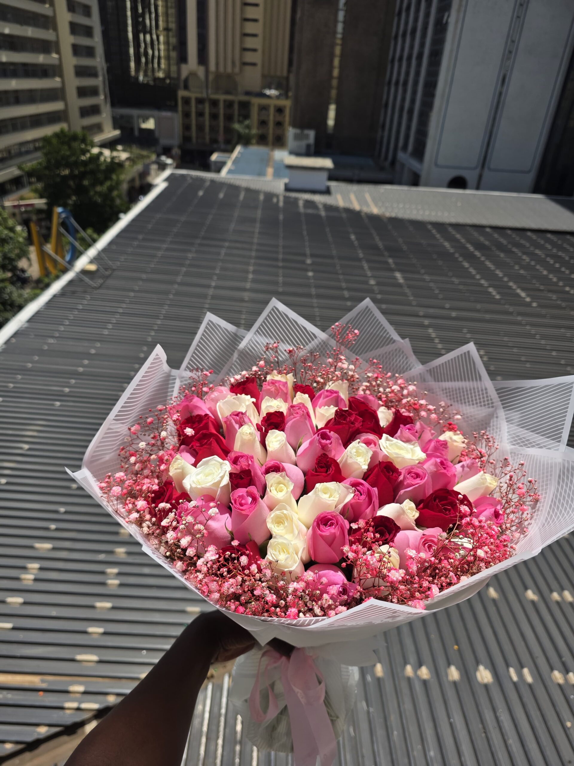 80 ROSES & COLORED BABY BREATH RIM