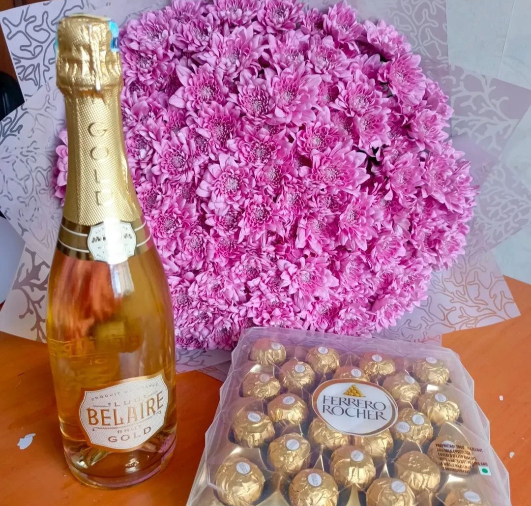 CHAMPAGNE,24 FERRERO CHOCOLATES & CHRYSANTHEMUMS BOUQUET